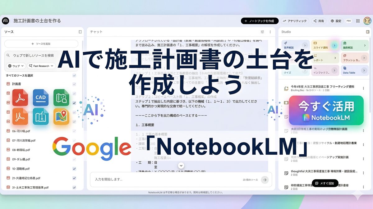 AIで施工計画書の土台を作成しよう【NotebookLM】 2026.03.24 施工管理 まさあき 建設ナビ 18:25 「圧縮に強く、引張りに弱い――コンクリートが鉄筋を必要とする理由」 2026.03.20 施工管理 まさあき 建設ナビ 15:12 建設業とは?高校生・大学生にわかりやすく解説|仕事の内容・種類・将来性 2026.02.20 施工管理 まさあき 建設ナビ 12:49 現場監督が測量する「新点(仮基準点)」の設置手順と注意点 2026.02.16 測量 まさあき 建設ナビ HO_CAD pao「円弧・楕円弧」の基本操作【初心者向け解説】 2026.02.09 CAD まさあき 建設ナビ 06:24 HO_CAD pao【測量関係の設定】|ダイアログの使い方と解説 2026.01.24 CAD まさあき 建設ナビ 08:19 AIのプロンプトは【改行】した方が良いのか?― Gemini と ChatGPT に直接聞いてみた ― 2026.01.11 PC・ICT まさあき 建設ナビ 建設業界の若手不足をどう解消するか「山形県立産業技術短期大学校・土木エンジニアリング科の挑戦」 2025.12.19 読書・ひとり言・お買い物などの雑記 まさあき 建設ナビ 08:03 スマホでサッと使える“器高式レベル計算”アプリを公開しました|水準測量の計算を自動化! 2025.11.22 測量 まさあき 建設ナビ 通勤途中の事故対応マニュアル|自損・対人・物損別の初動と報告手順をわかりやすく解説 2025.10.23 読書・ひとり言・お買い物などの雑記 まさあき 建設ナビ もっと見る