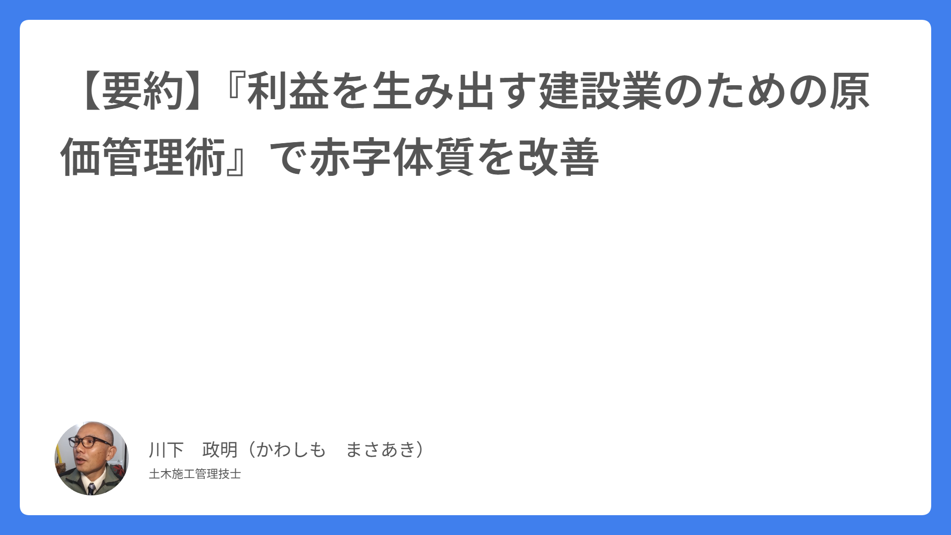 【要約】『利益を生み出す建設業のための原価管理術』で赤字体質を改善 2026.04.25 読書・ひとり言・お買い物などの雑記 川下 政明 建設ナビ 14:11 XY座標を平面図に設定する方法【A納図】初心者でも分かる手順解説 2026.04.25 CAD 川下 政明 建設ナビ 03:58 ハッチング中抜き方法|A納図の操作手順を徹底解説 2026.04.08 CAD 川下 政明 建設ナビ アスファルトとは?種類と用語を現場目線でわかりやすく解説 2026.04.05 施工管理 川下 政明 建設ナビ AIで施工計画書の土台を作成しよう【NotebookLM】 2026.03.24 施工管理 川下 政明 建設ナビ 18:25 「圧縮に強く、引張りに弱い――コンクリートが鉄筋を必要とする理由」 2026.03.20 施工管理 川下 政明 建設ナビ 15:12 建設業とは?高校生・大学生にわかりやすく解説|仕事の内容・種類・将来性 2026.02.20 施工管理 川下 政明 建設ナビ 12:49 現場監督が測量する「新点(仮基準点)」の設置手順と注意点 2026.02.16 測量 川下 政明 建設ナビ HO_CAD pao「円弧・楕円弧」の基本操作【初心者向け解説】 2026.02.09 CAD 川下 政明 建設ナビ 06:24 HO_CAD pao【測量関係の設定】|ダイアログの使い方と解説 2026.01.24 CAD 川下 政明 建設ナビ もっと見る