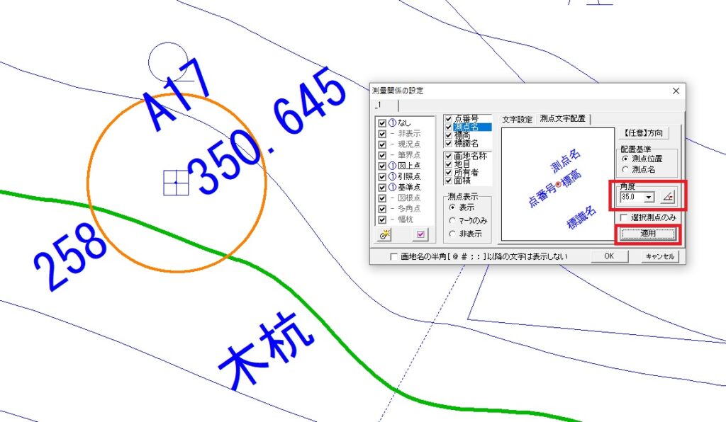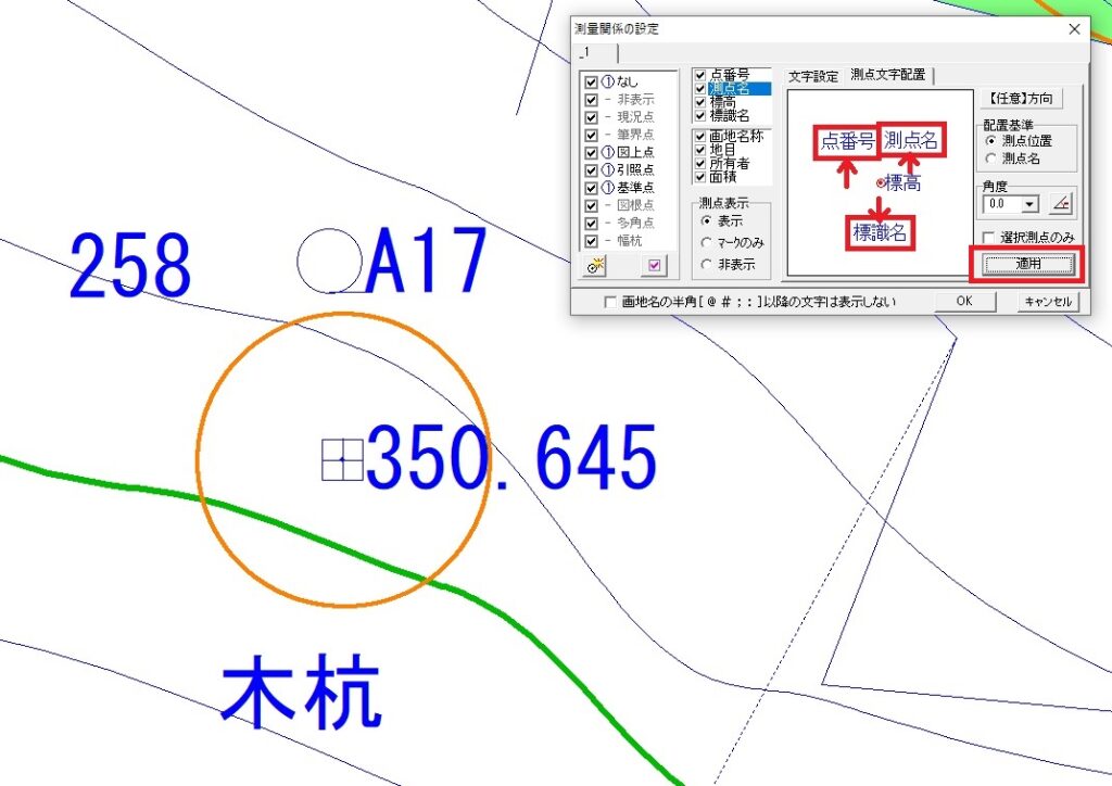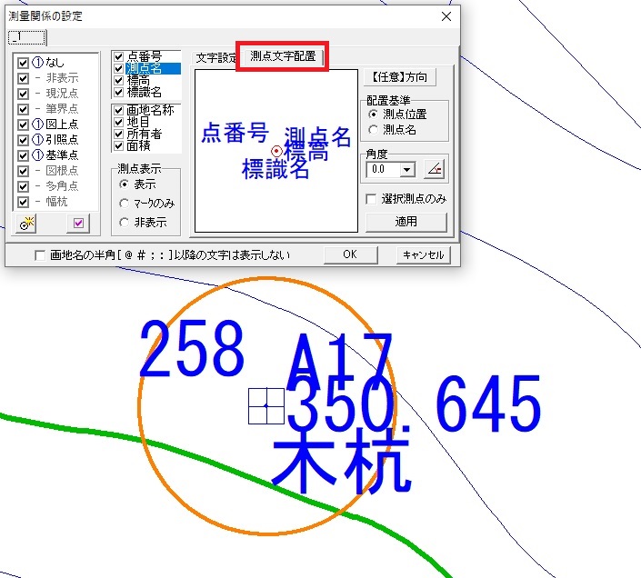 ここでは、測点文字の重なりを防ぐために、各表示項目の位置を調整する方法を解説します。