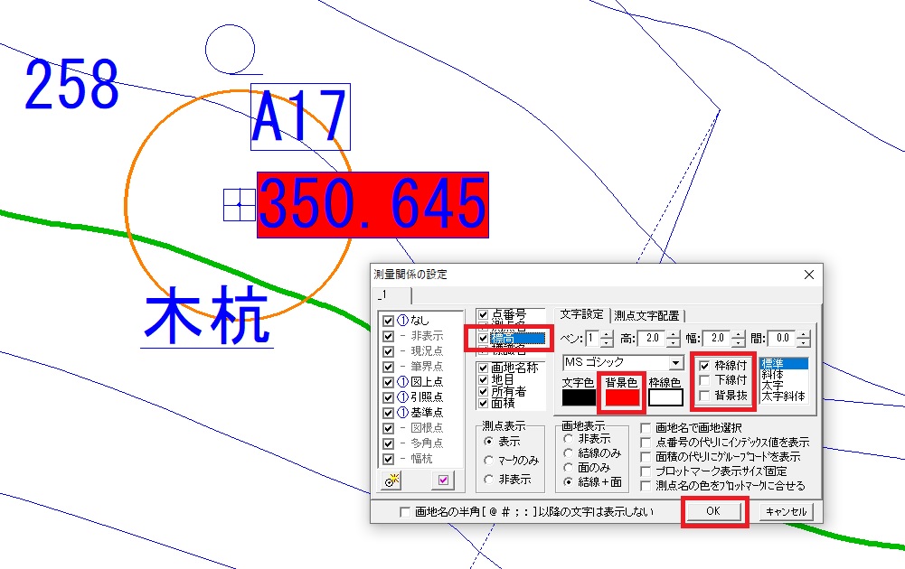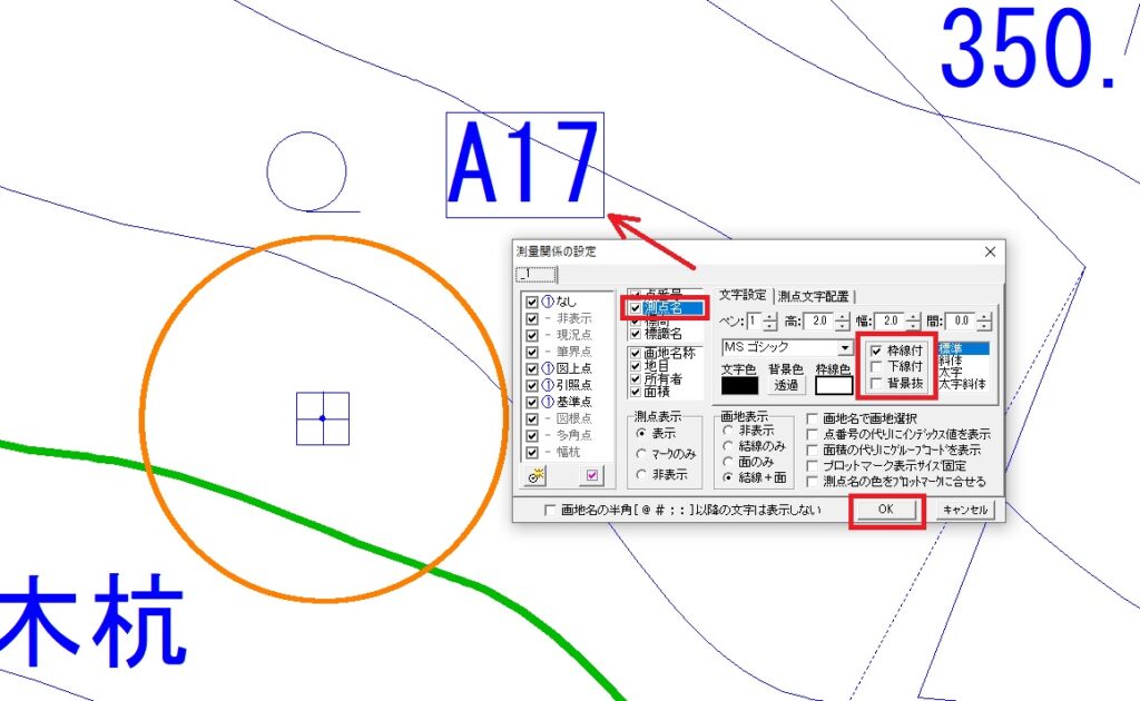 測点名をクリックして青色にします。次に「枠線付き」にチェックマークをつけて「OK」をクリックすると枠線付きのA17が表示されます。