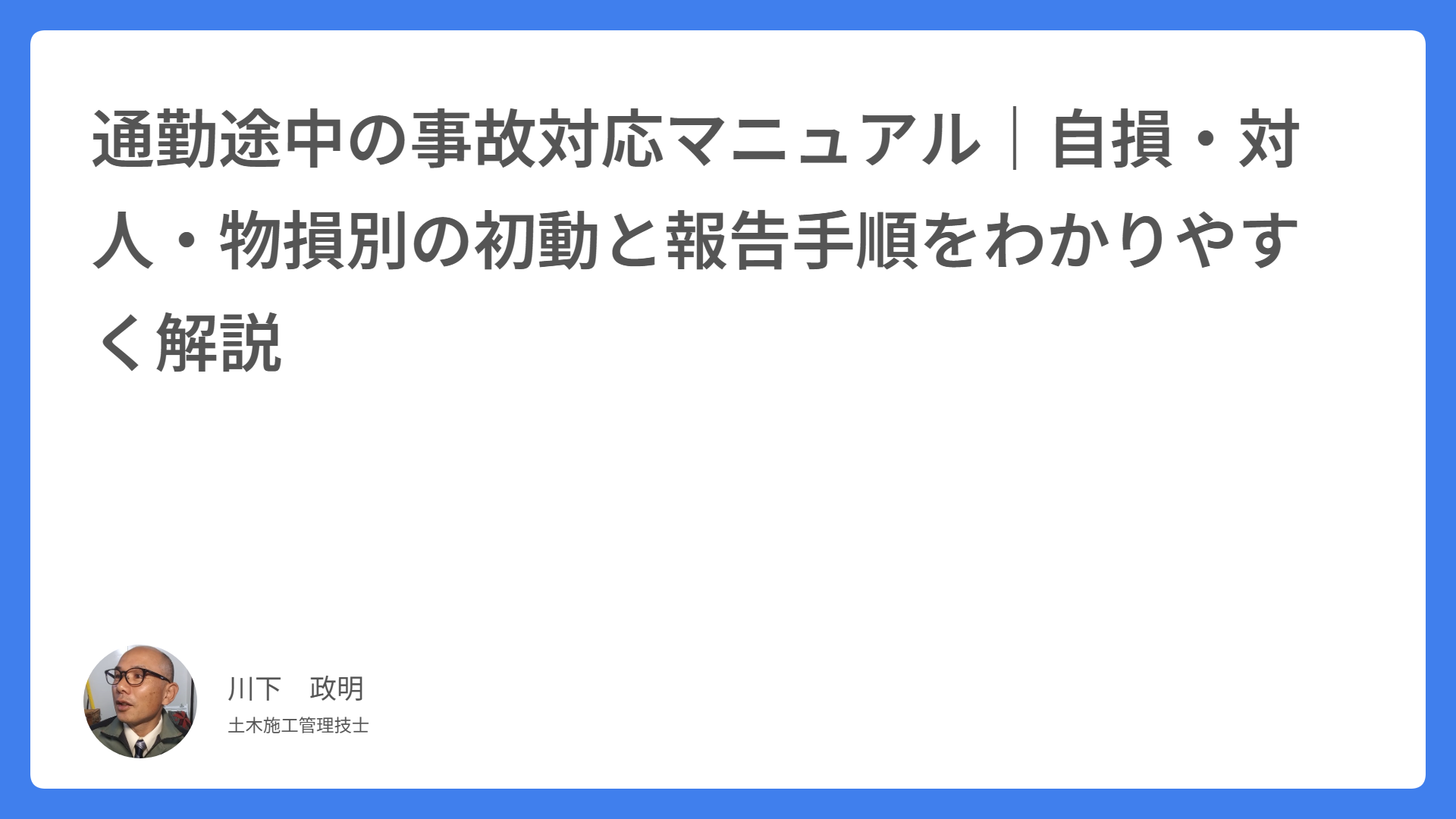 TAG 施工管理 通勤途中の事故対応マニュアル|自損・対人・物損別の初動と報告手順をわかりやすく解説 2025.10.23 読書・ひとり言・お買い物などの雑記 まさあき 建設ナビ 熱中症への取組について【2025年6月1日施行 労働安全衛生規則改正を踏まえて】 2025.06.24 施工管理 まさあき 建設ナビ 09:49 建設業の見積書に欠かせない「法定福利費」とは?意味と計算方法をわかりやすく解説! 2025.04.10 施工管理 まさあき 建設ナビ 07:05 【Chat GPT】で建設現場で使える文章を作ろう 2025.01.21 PC・ICT まさあき 建設ナビ 05:25 図面の【縮尺】は㎜単位で考えるとわかりやすい 2024.11.09 施工管理 まさあき 建設ナビ 電子レンジで【含水比】を測定しよう 2024.11.01 施工管理 まさあき 建設ナビ RIによる密度の測定方法 2024.10.09 施工管理 まさあき 建設ナビ 11:35 【締固め曲線】の書き方|最大乾燥密度と最適含水比について 2024.05.18 施工管理 まさあき 建設ナビ 07:56 施工計画横断図を作ってみよう【HO_CAD】 2024.04.07 CAD まさあき 建設ナビ 【働き方改革】の大きな目的を理解しよう 2024.03.28 施工管理 まさあき 建設ナビ もっと見る